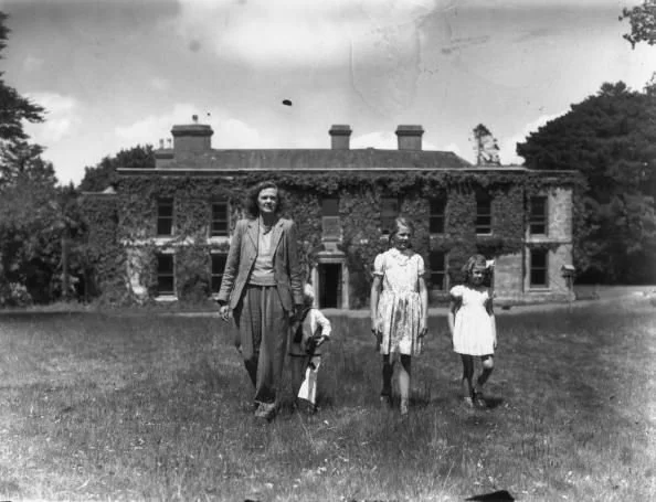 Du Maurier with her children outside an abandoned house called Menabilly in Fowey, Cornwall, which became the inspiration for Manderley.